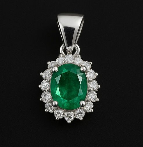 -Grado AAA : Joya dije con esmeralda colombiana ovalada 10mm color intenso, cristal ,pureza con diamantes en oro blanco 18 kilates certificada.